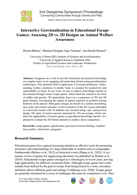 Our work on educational escape games got published in the proceedings of the second Geogames Symposium in Dublin 2025! In the short paper, we present a comparison of two different game versions on animal welfare in poultry production. Read the paper here. A full-length publication will follow. The 2D game as well as the 3D game can be accessed online.